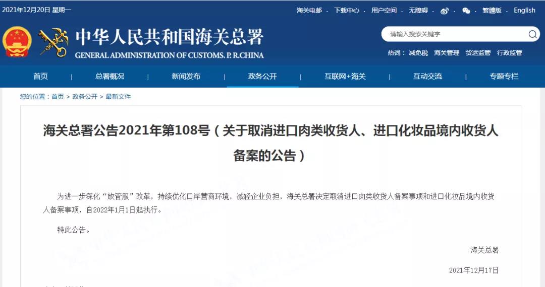 2021年12月17日,海關(guān)總署發(fā)布2021年第108號(hào)公告:為進(jìn)一步深化“放管服”改革,持續(xù)優(yōu)化口岸營商環(huán)境,減輕企業(yè)負(fù)擔(dān),海關(guān)總署決定取消進(jìn)口肉類收貨人備案事項(xiàng)和進(jìn)口化妝品境內(nèi)收貨人備案事項(xiàng),自2022年1月1日起執(zhí)行。