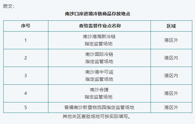 三、南沙國際冷鏈指定監管場地計劃于10月25日開展冷鏈查驗作業,但目前暫不具備凍肉和冰鮮水產品指定監管場地資質,因此進口這兩種冷鏈產品的企業在填寫“貨物存放地點”時,不得填寫南沙國際冷鏈指定監管場地作為“貨物存放地點”,其他冷鏈產品按第二條要求執行。