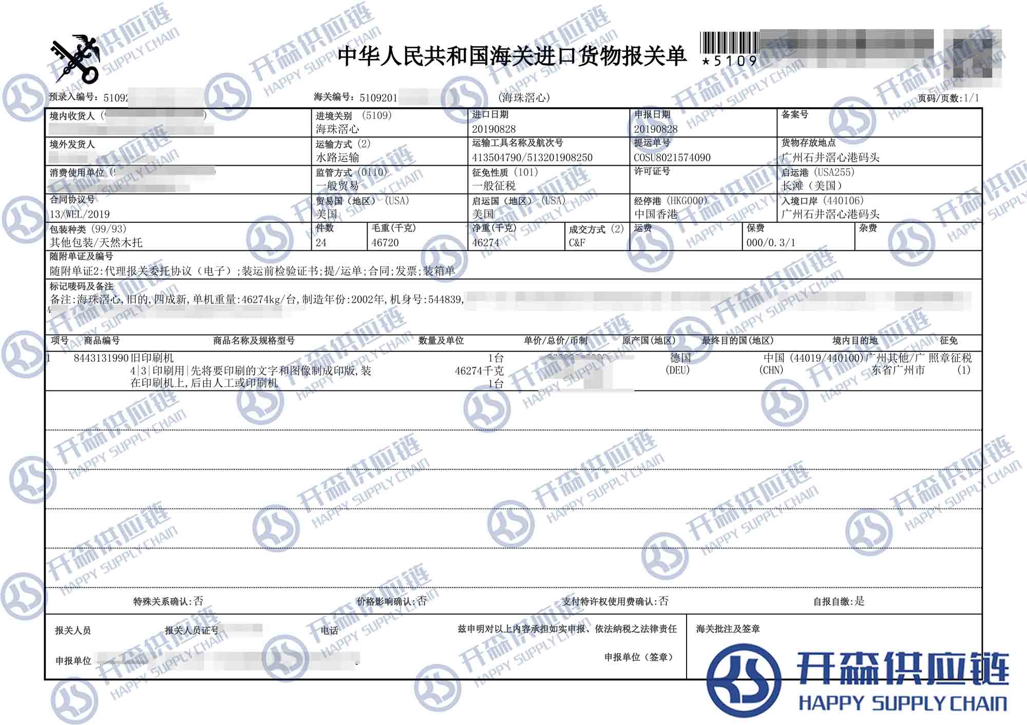 【本文結語】 上述就是【進口案例】廣州港二手印刷機進口報關代理服務的全部內容,希望能對您有所幫助,如有二手印刷機進口報關上任何疑問及問題可隨時在線聯系我們或撥打 18002611553,開森供應鏈擁有豐富的二手印刷機進口報關操作經驗及案例,10余年進口經驗為您所用,各類進口疑難都能為您一一解答及協助快速處理解決!