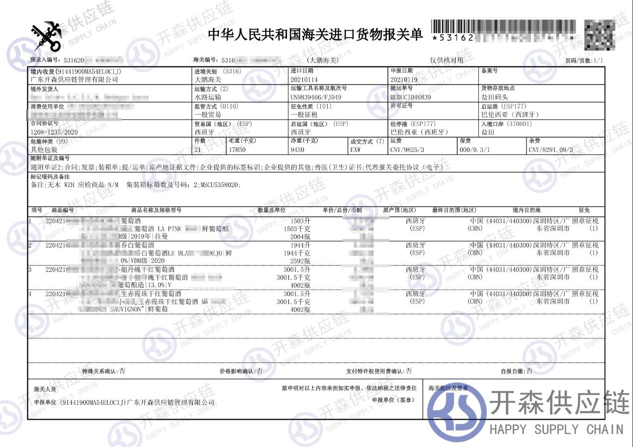 上述就是【進(jìn)口案例】西班牙葡萄酒進(jìn)口報關(guān)代理服務(wù)的全部內(nèi)容,希望能對您有所幫助,如有葡萄酒進(jìn)口報關(guān)上任何疑問及問題可隨時在線聯(lián)系我們或撥打 18002611553,開森供應(yīng)鏈擁有豐富的葡萄酒進(jìn)口報關(guān)操作經(jīng)驗(yàn)及案例,10余年進(jìn)口經(jīng)驗(yàn)為您所用,各類進(jìn)口疑難都能為您一一解答及協(xié)助快速處理解決!