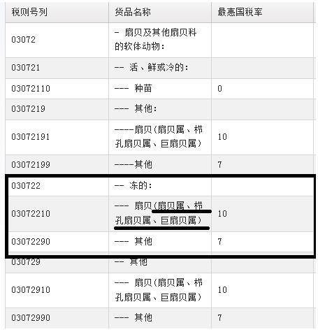 其中根據貨物不同的保存狀態(“活、鮮或冷的”“凍的”“其他”)歸入不同的二級子目項下,這點比較容易區分,如何選擇正確的本國子目則比較難以區分。以進口量最大的“冷凍蝦夷貝”為例,在日常申報實際中,03072210和03072290均有申報,兩者最惠國稅率分別為10%和7%,如果不能正確歸類,給海關監管以及稅收征管都會帶來不利影響,企業也會面臨通關延誤、被后續稽查甚至處罰的風險。